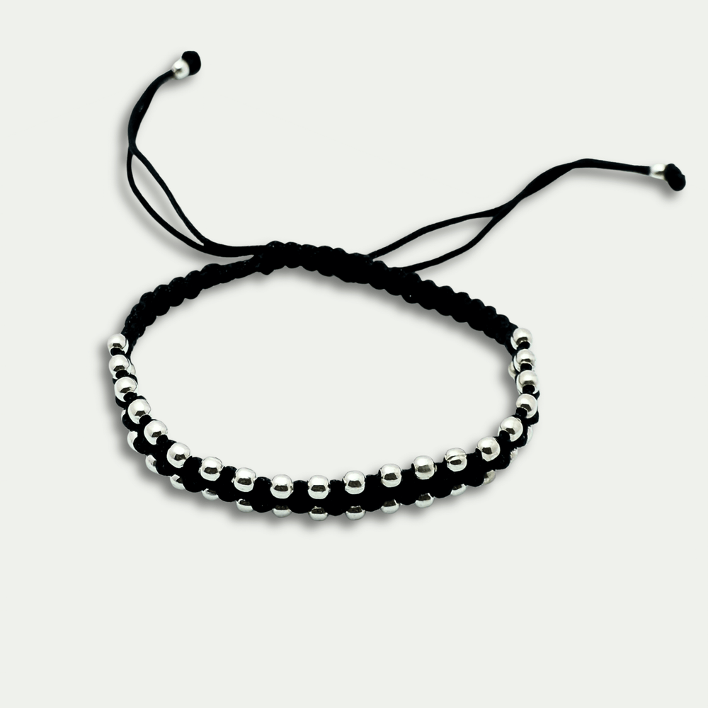 This bracelet blends tradition and modern style in a simple yet elegant way. It features rows of polished 925 sterling silver beads placed on a soft black thread, creating a clean and minimal look. The design is subtle, yet it stands out because of its shine and handcrafted charm. As a result, it works well for both daily wear and special moments.