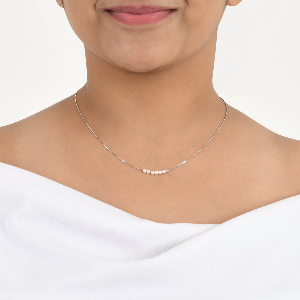 Some jewellery pieces are created to capture beauty in its purest form, and this necklace is designed exactly with that intention. Featuring a row of five hand-selected freshwater pearls arranged on a sleek sterling silver bar, this piece blends minimalism with classic charm. The pearls form a graceful arc that appears to float naturally along your neckline, bringing a soft radiance to any outfit. Each pearl is chosen for its natural sheen, smooth texture, and timeless elegance.